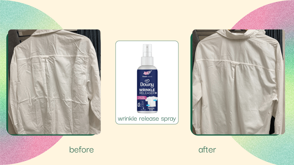 This travel-sized spray worked surprisingly well and has come in handy when I don’t have access to an iron or steamer. The trick is to hang clothes up on a hanger, spray across in an X formation, then use your hands to smooth it out in sections. It works pretty well for cotton shirts and linen pants. The only downside I’ve found is that it does have a strong laundry smell.
